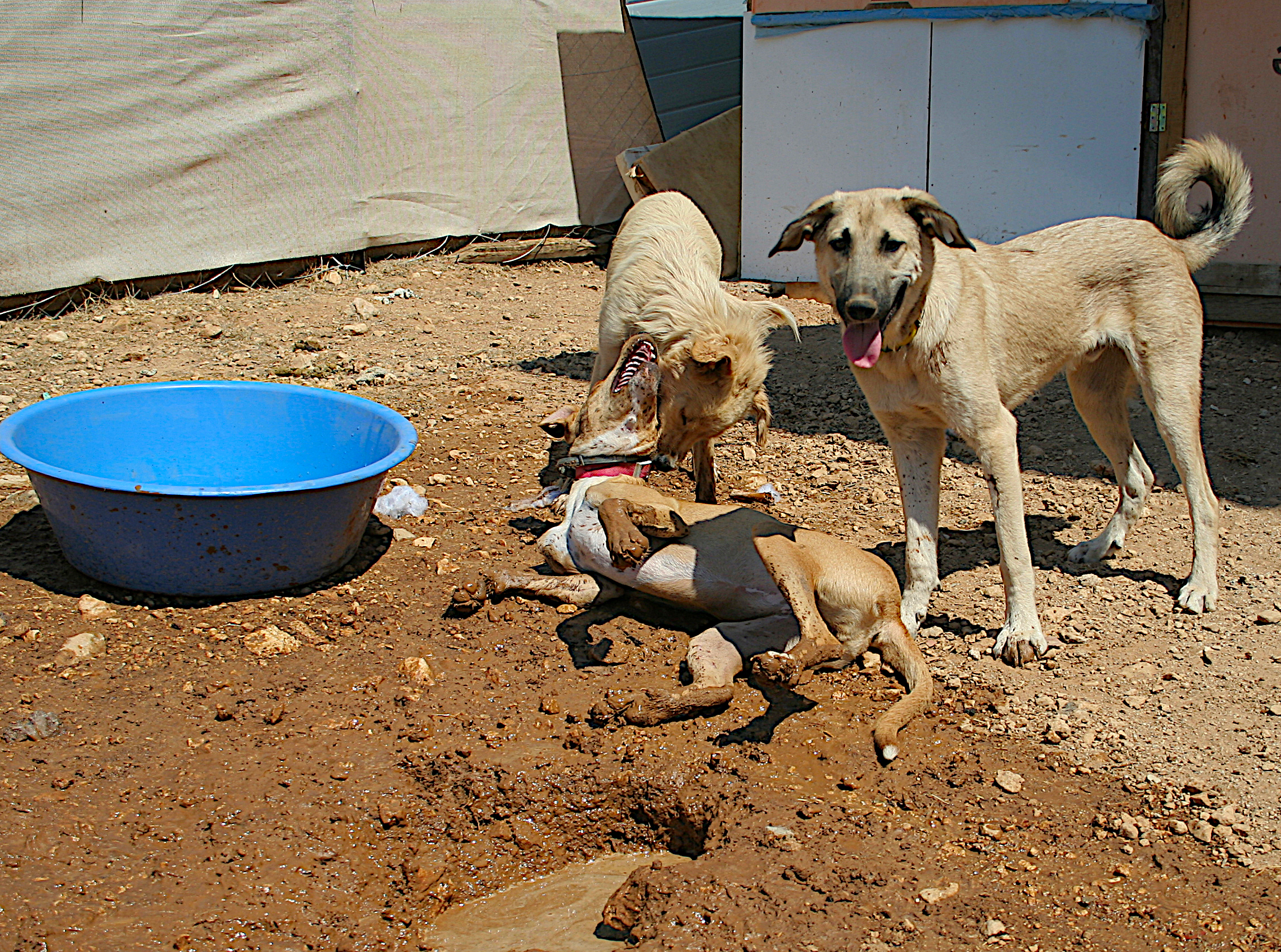 As you may imagine with around 30 odd dogs running around at any one time the garden is a busy place, most of the dogs get on with each other to a large degree but if one finds a bone the ownership of it is bound to be contested. Some of the dogs love to play with water and turn it into mud.