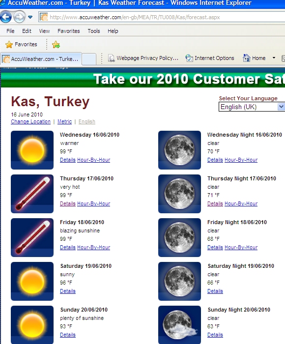 Being warm here in summer is quite normal, temperatures of 40C and higher happen regularly but I’m posting this picture of a weather forecast site because I like the terminology. Not for these folk to say ‘very warm’ or very sunny’, check out Friday’s forecast.