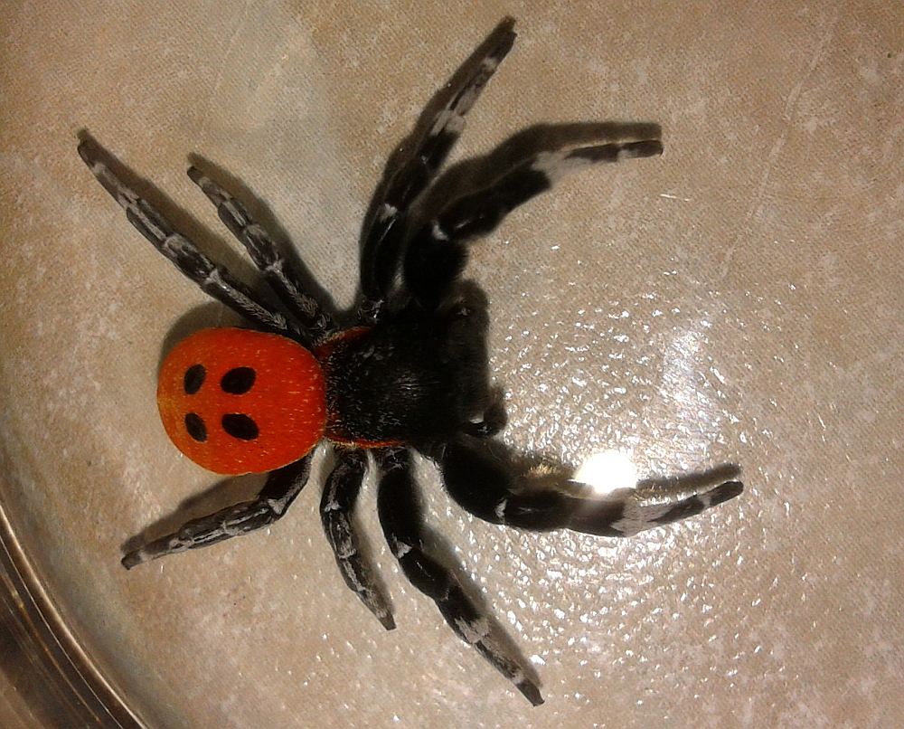 This Ladybird Spider (Eresus cinnaberinus) came marching across the patio. Nice colouring and regarded as endangered in UK it only exists in a secret location in Dorset apparently, plenty of them in Mediterranean coasts though.