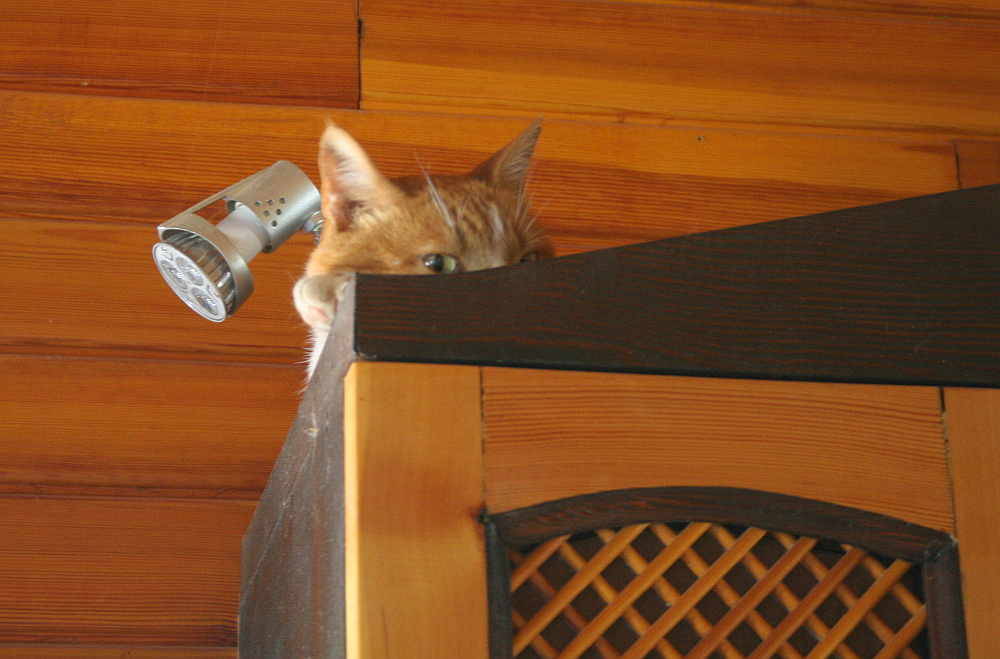 Lovable little things though they are Stanley likes to keep an eye on them from the privacy of the top of a kitchen cupboard.