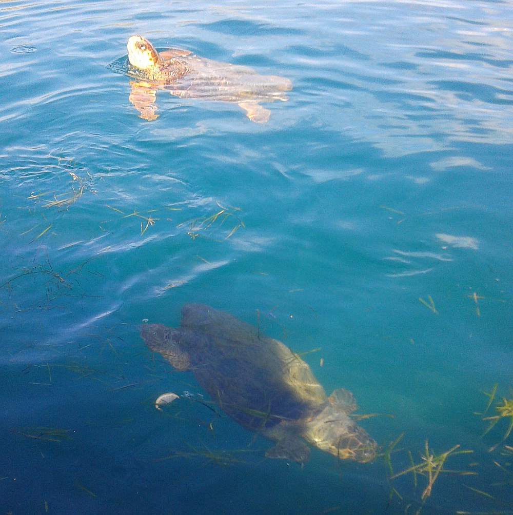When the Meis fishermen bring some fish back the restaurant owners usually clean them on the harbour side, I was going to say harbour wall but there is no wall, the road just stops and the water is next, you can easily take a wrong step and get very wet if you’re not careful. Well this day Angelos was cleaning and filleting a big fish and throwing the innards and spine into the water. I have often seen a big turtle swim up and eat the bits but this day two of them came and started to push each other out of the way to get the bits of fish. It was quite a startling sight to see the two of them performing all sorts of diving, wheeling and flying right next to where I was standing, like an aquatic ballet in three dimensions. I hadn’t taken my good camera with me so these photographs are only from my phone camera, apologies for the quality.