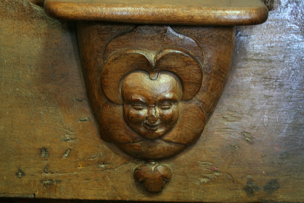 We visited the abbey at Lonlay L’Abbaye, I was intrigued by the carvings under the pew seats. Some of the pews had a high back and a lift up seat so that people could stand and lean on a ledge sticking out from the bottom of the seat. This ledge was supported by a carved wooden wedge, the carvings depict various designs and faces, this one is a smiling village woman, possibly the woman who used that particular pew?